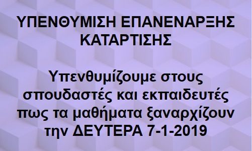 Υπενθυμίζουμε στους σπουδαστές και εκπαιδευτές του Δημοσίου ΙΕΚ Έδεσσας πως τα μαθήματα μετά τις διακοπές των Χριστουγέννων ξαναρχίζουν την ΔΕΥΤΕΡΑ 7 Ιανουαρίου 2019