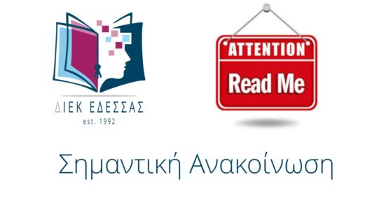 Σας ενημερώνουμε πως την Τετάρτη 17 Οκτωβρίου 2018 θα ξεκινήσουν τα μαθήματα για το Χειμερινό Εξάμηνο 2018 στο ΙΕΚ Έδεσσας. Παρακαλούνται οι σπουδαστές, δευτεροετείς και πρωτοετείς, να παραβρίσκονται στον προαύλιο…