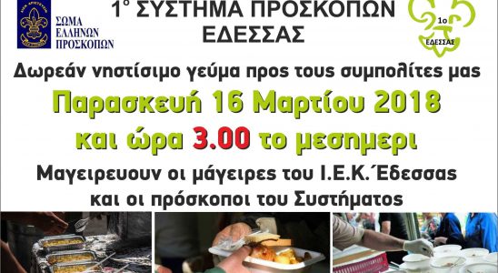 Κάνοντας πράξη την ιδέα του “Εθελοντισμού”, η 1η Ομάδα Προσκόπων Έδεσσας σε συνεργασία με τους Αρχιμάγειρες (Chef) του ΔΙΕΚ Έδεσσας, μαγείρεψαν και πρόσφεραν νηστίστιμη σούπα για όλους. Η κοινή δράση…