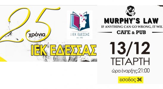 Με πολύ κέφι, χορό και διασκέδαση γιορτάστηκαν τα 25 χρόνια λειτουργίας του ΙΕΚ Έδεσσας την Τετάρτη 13/12/2017. Στο ασφυκτικά γεμάτο “Myrphy’s Law” οι σπουδαστές, παλιοί και νέοι, καθώς και το…