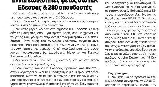 Άρθρο της "Εδεσσαϊκής" για το ΔΙΕΚ Έδεσσας