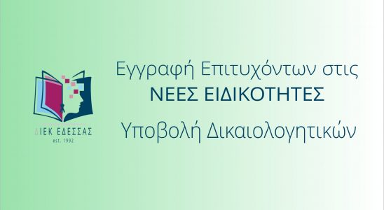 ΤΕΛΕΥΤΑΙΑ ΕΥΚΑΙΡΙΑ ΕΓΓΡΑΦΗΣ ΣΤΙΣ ΝΕΕΣ ΕΙΔΙΚΟΤΗΤΕΣ ΤΟΥ 2024-25 Σας ενημερώνουμε πως δόθηκε η δυνατότητα, για όσους δεν πρόλαβαν να κάνουν ηλεκτρονική αίτηση, να εγγραφούν στις εναπομείναντες κενές θέσεις των παρακάτω…