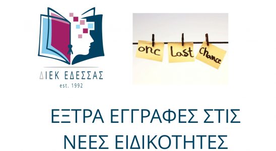 ΤΕΛΕΥΤΑΙΑ ΕΥΚΑΙΡΙΑ ΕΓΓΡΑΦΗΣ ΣΤΙΣ ΝΕΕΣ ΕΙΔΙΚΟΤΗΤΕΣ ΤΟΥ 2021-22 Σας ενημερώνουμε πως δόθηκε η δυνατότητα, για όσους δεν πρόλαβαν να κάνουν ηλεκτρονική αίτηση, να εγγραφούν στις εναπομείναντες κενές θέσεις των παρακάτω…