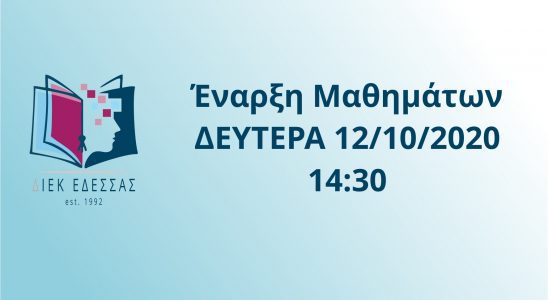 ΕΝΑΡΞΗ ΜΑΘΗΜΑΤΩΝ ΧΕΙΜΕΡΙΝΟΥ ΕΞΑΜΗΝΟΥ 2020Β ΣΤΟ ΔΙΕΚ ΕΔΕΣΣΑΣ ΤΗΝ ΔΕΥΤΕΡΑ 12/10/2020