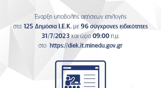 Από τη Δευτέρα 31 Ιουλίου 2023 και ώρα 09:00 π.μ. αρχίζει η ηλεκτρονική υποβολή αιτήσεων επιλογής καταρτιζόμενων στο Δημόσιο Ινστιτούτο Επαγγελματικής Κατάρτισης Έδεσσας (ΔΙΕΚ ΕΔΕΣΣΑΣ) για το έτος κατάρτισης 2023-2024.Δικαίωμα…